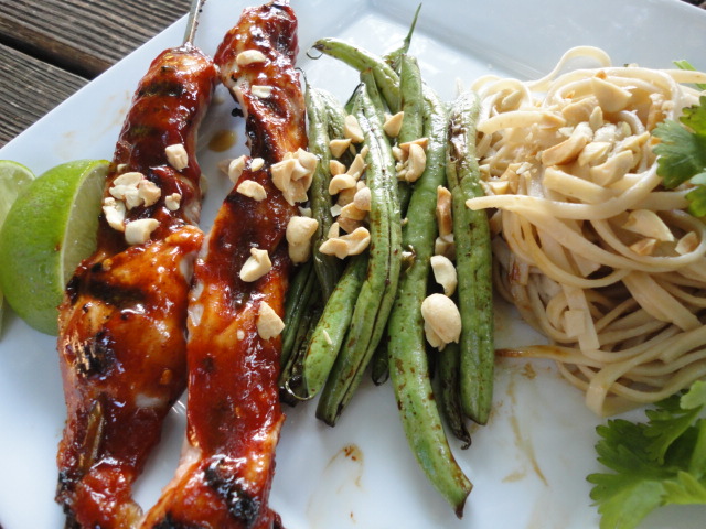 Sometimes I just get in a rut and nothing really sounds good. My family is the same way so instead of eating out on this particular night I made something a little different than I have in a while. I am not good at incorporating Asian flavors into our meals but this time I was successful and made something that we all loved! If I had known how much we would have liked it I would have doubled it. This takes just a few ingredients and can be done in about 30 minutes. Your kids will like having dinner presented to them in a little different way, if you leave the meat on the skewers. I used metal ones this time to avoid the dreaded ‘bamboo burn’ that I get when I forget to soak them before hand.