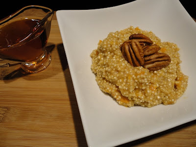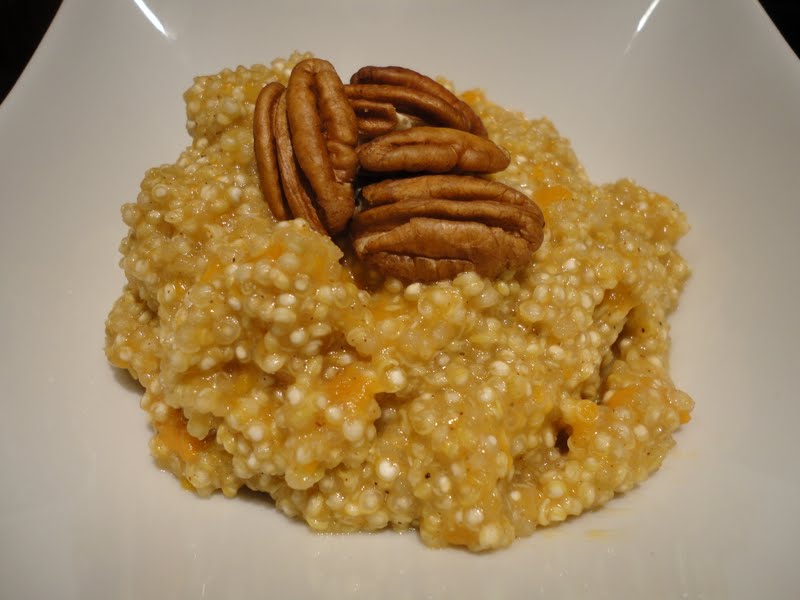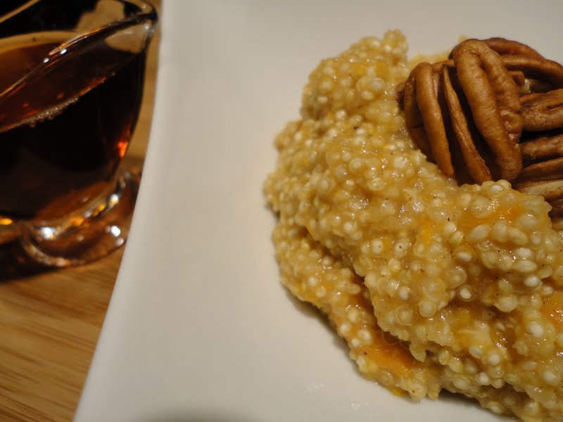 In a separate saucepan melt the butter.  Add the cinnamon, milk, salt and pumpkin.  Whisk to combine.  When the quinoa has finished cooking add the pumpkin mixture.  I garnished mine with a little more syrup and a few pecans!