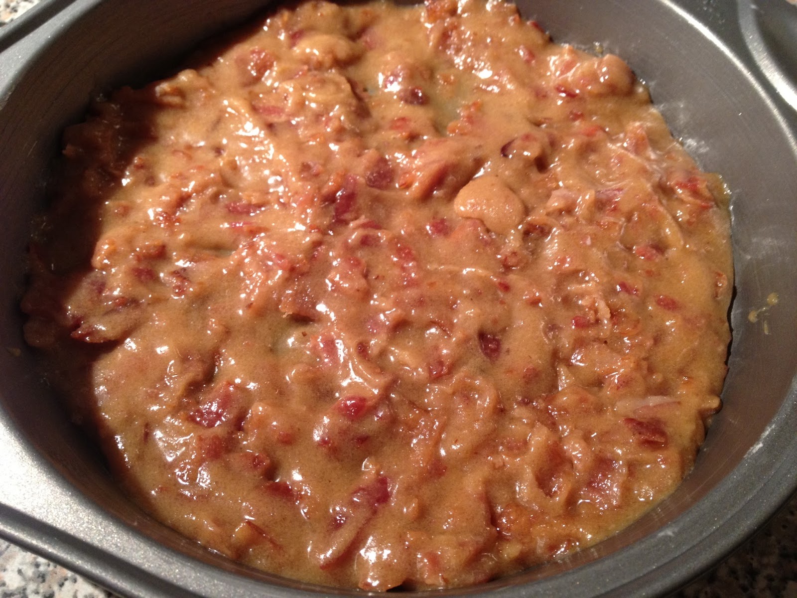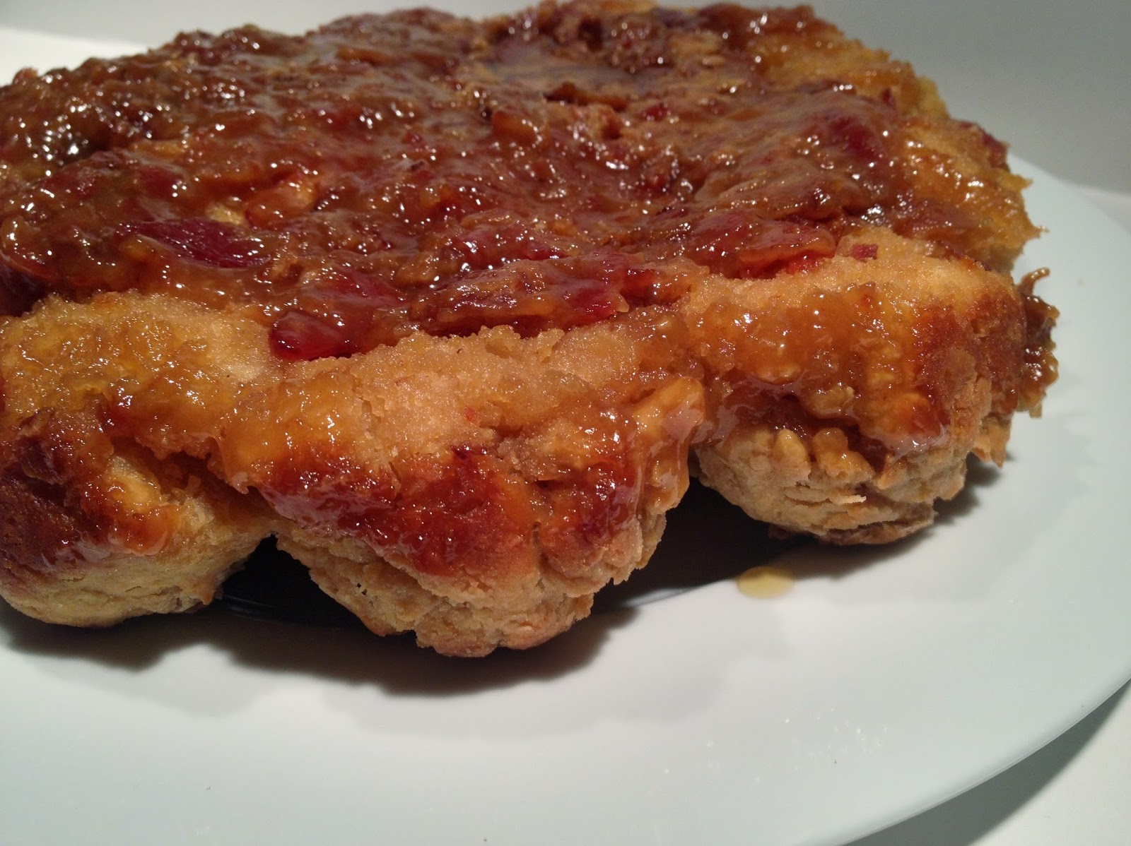 To make the syrup: chop or crumble the bacon in to very small pieces.  Combine bacon with the rest of the syrup ingredients, stirring well.  Spread in the bottom of the prepared pan.