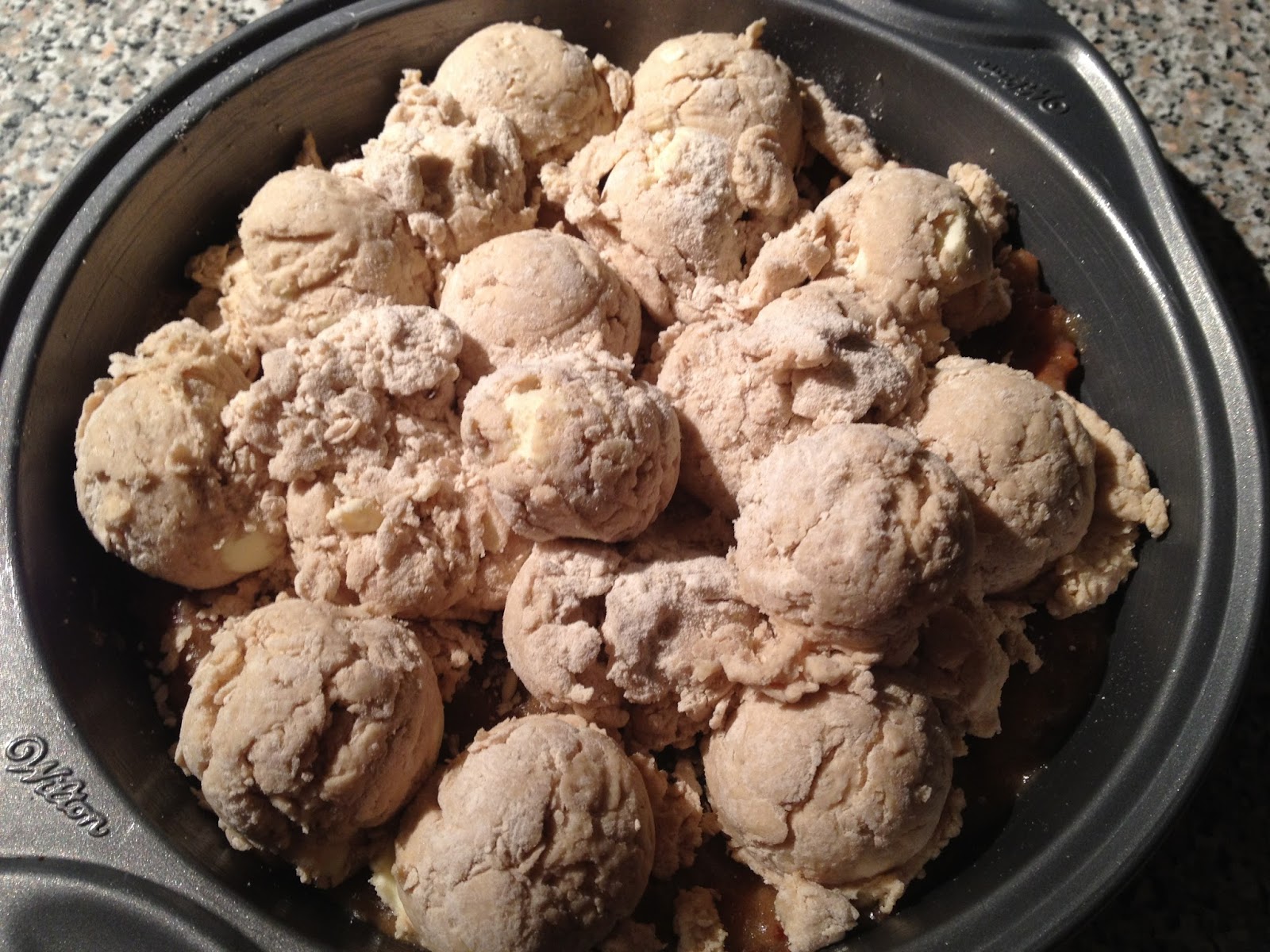 Drop the dough in heaping tablespoonfuls atop the syrup in the pan. A tablespoon scoop, slightly over-filled, works well here.