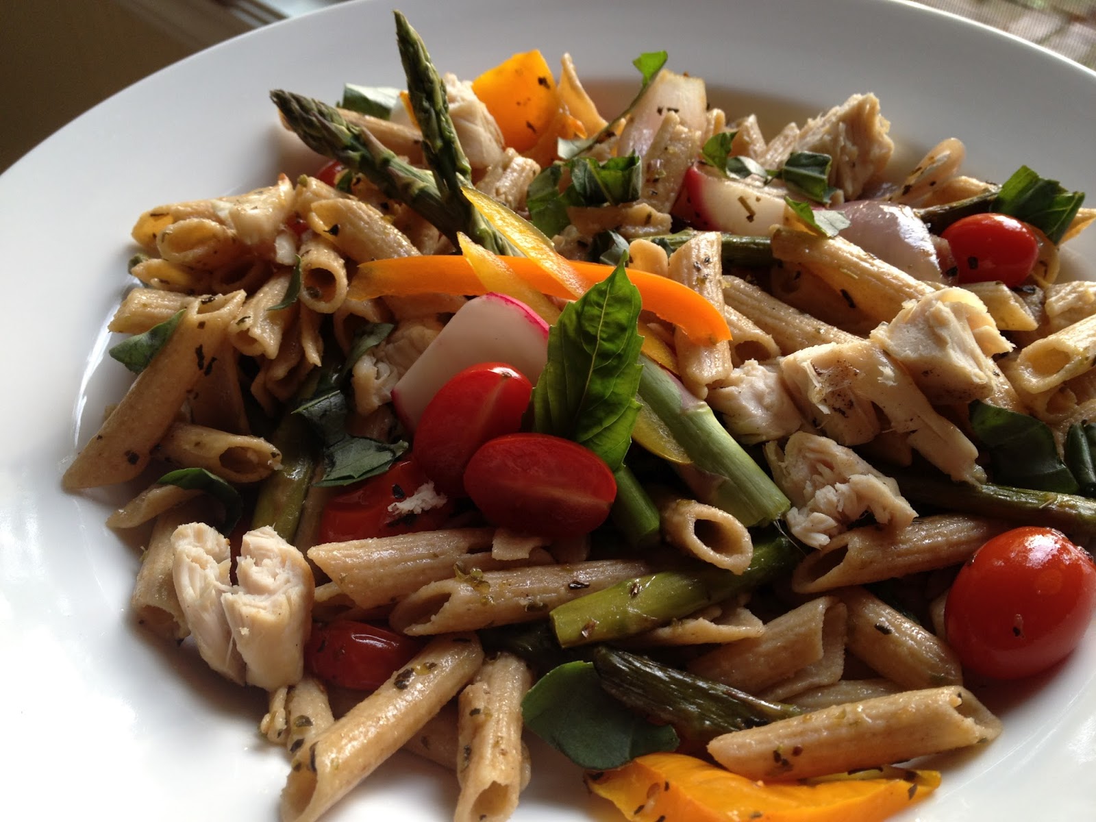 I am often asked what I eat when I want to prepare a fast, healthy and budget friendly meal that my kids will still eat.  I do not want to make myself a separate meal so I try my best to make something that hits all of my dietary needs.  Whole grains, lean mean, low in fats and high in vegetables.  The meal that I am sharing today covers all of those bases.  I used a selection of our favorite roasted vegetables along with whole wheat pasta, cooked al dente.  Toss that with some olive oil, lemon juice, cubed chicken, a bit of feta and some chopped fresh herbs like basil to finish it off and you have a meal your whole family will eat.  Best of all they don’t know how good it is for them.