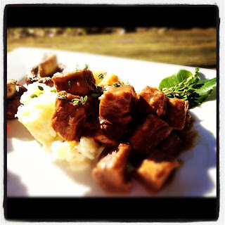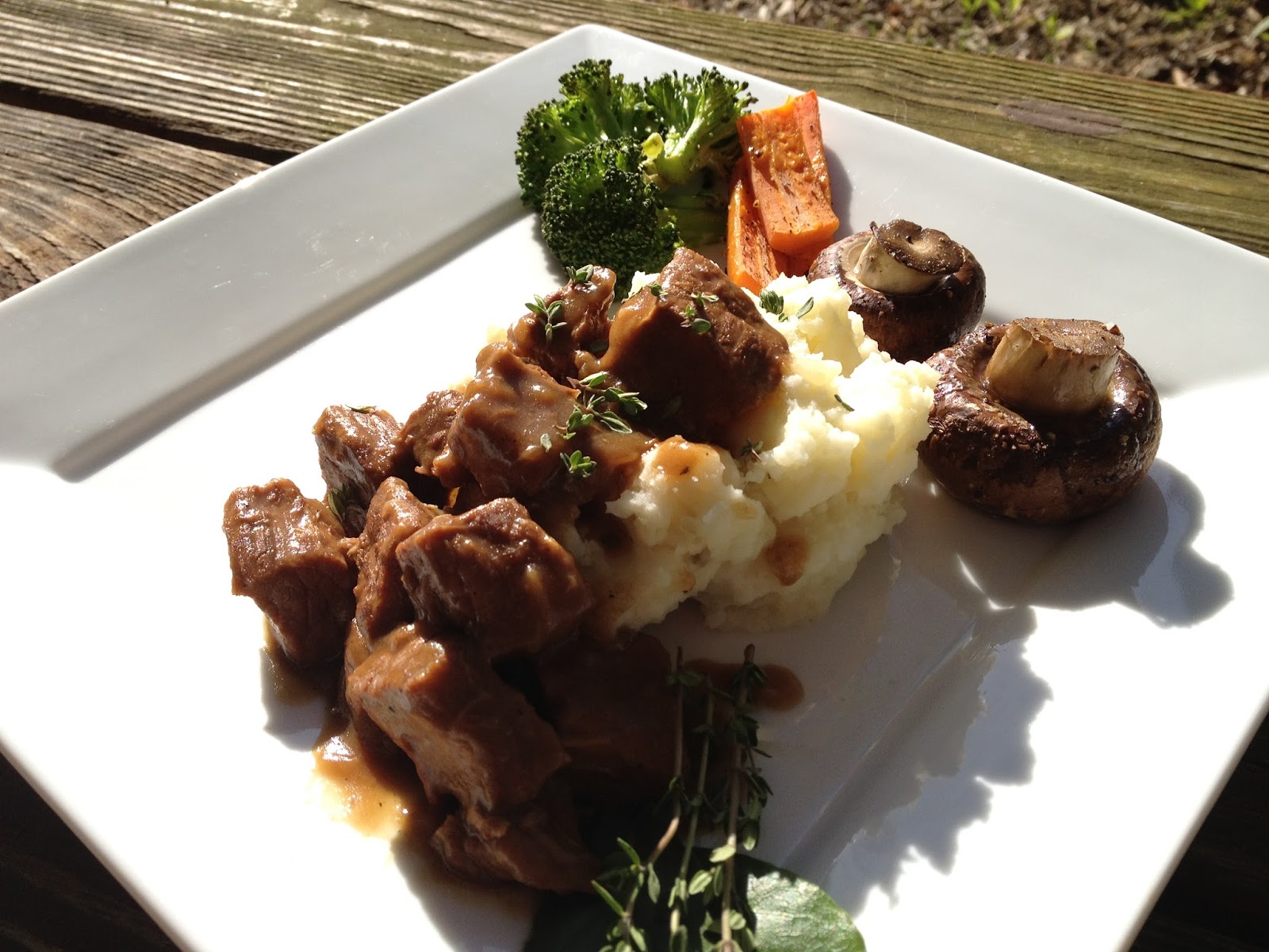 I smashed some potatoes with cream and chives, roasted some giant mushrooms and carrots tossed in olive oil and garlic and made a loaf of crusty bread to mop up the delicious sauce. Garnish with a bit of fresh thyme and freshly cracked pepper.