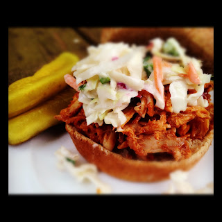 On a bun, place a small amount of the chicken mixture and top with a spoonful of slaw.