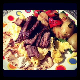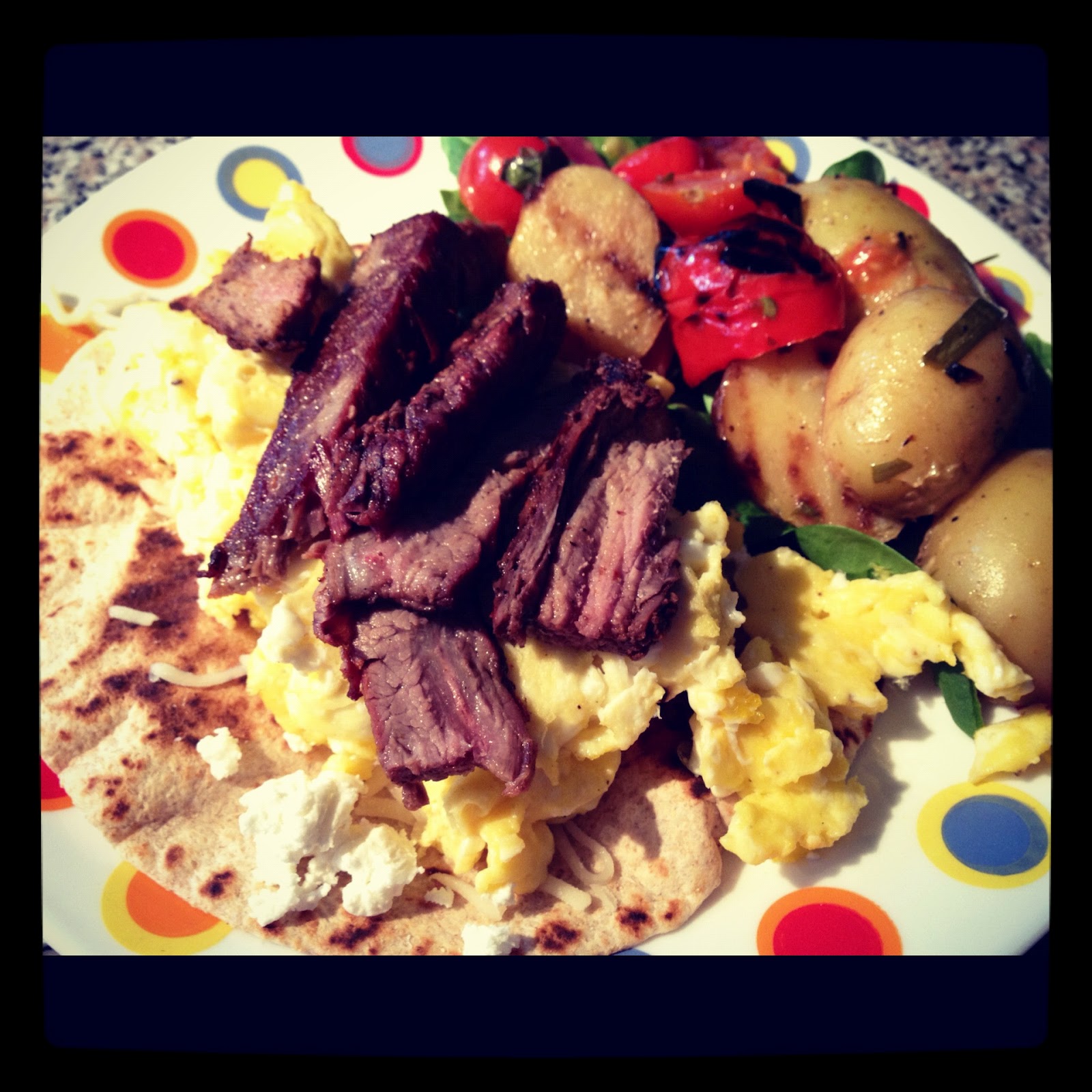 Grilled tortilla, flank steak, goat cheese, spinach and leftover grilled potato salad